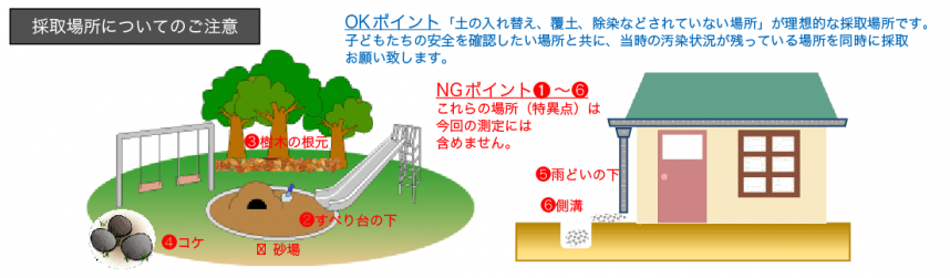 ○ Using an air dose meter, grasp the rough dose in the vicinity. Extremely high dose hotspots (singular points), for example, soils and gravels that are under rain gutters or in gutters, should NOT be defined as sampling points.